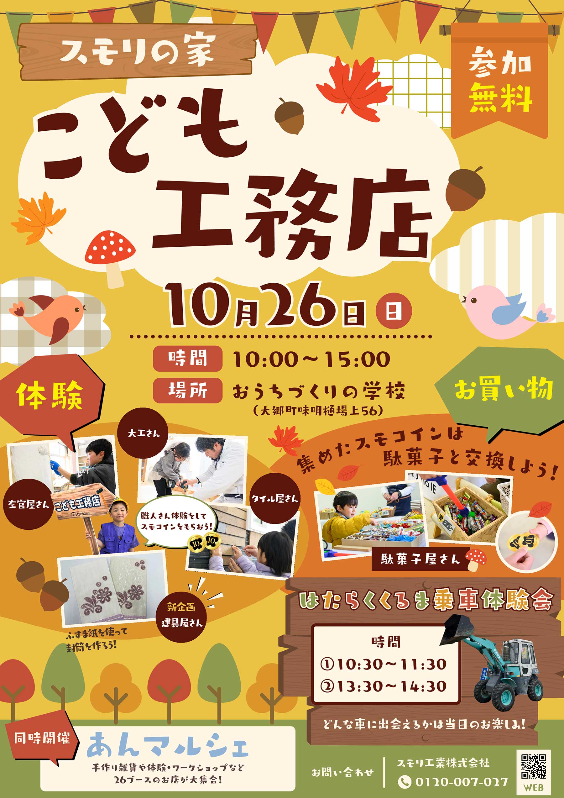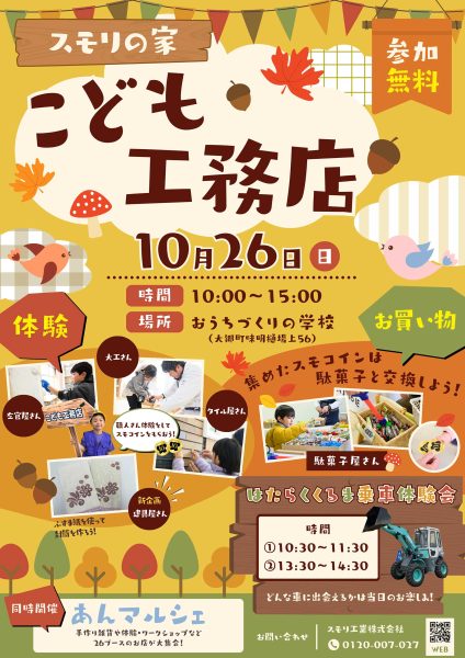 2025年10月26日(日)、スモリの家の「たのしいおうちづくりの学校」で、大人気イベント「こども工務店」と「あんマルシェ」のコラボイベントを開催いたします!
