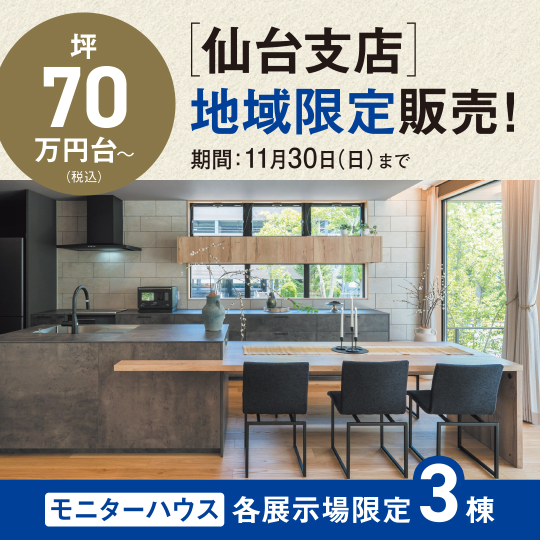自由設計の住まいに、暮らしが豊かになる“上質な設備・仕様”を仙台支店のお客様限定でご用意しました。 各展示場限定3棟までとなっておりますので、お早めにご検討ください。