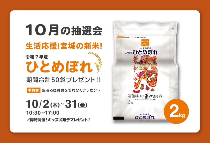 (9月25日更新) 平日 4 土 5 日 11 土 12 日 13 祝 18 土 19 日 25 土 26 日 10月の抽選会「宮城の新米ひとめぼれ」 ● ● ● ● ● ● ● ● ● ● KIDSイベント「ちびっ […]