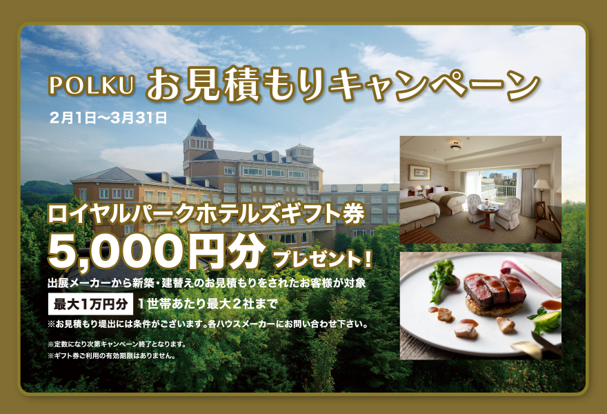 (1月24日更新) 平日 7 土 8 日 11 祝 14 土 15 日 21 土 22 日 23 祝 28 土 1 日 2月の抽選会(2/2〜3/1) ● ● ● ● ● ● ● ● ● ● ● POLKUのお見積も […]